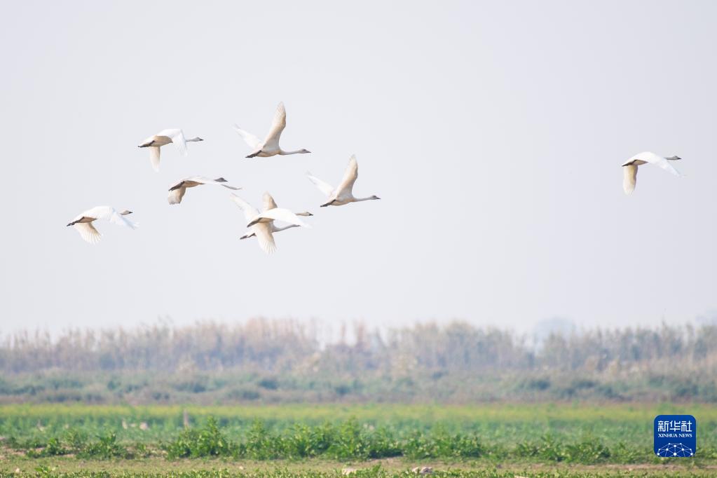 11月10日,小天鵝在湖南西洞庭湖濕地上空飛翔。