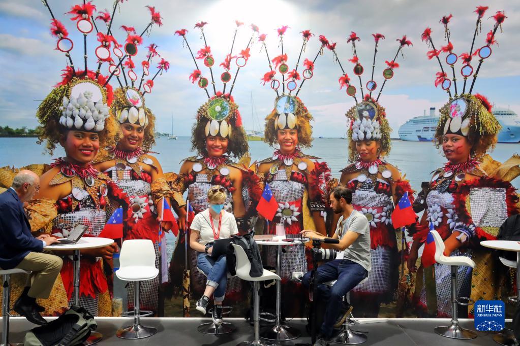 11月10日,在埃及沙姆沙伊赫,參會(huì )者坐在聯(lián)合國氣候變化大會(huì )展區內一塊宣傳板旁。