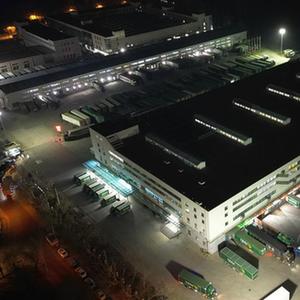 這是11月10日在中國郵政哈爾濱郵區中心局郵件處理中心拍攝的??康目爝f運輸車(chē)(無(wú)人機照片)。