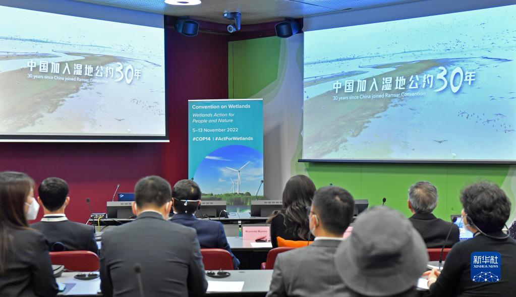 這是11月10日在瑞士日內瓦拍攝的“《濕地公約》履約30周年——中國濕地保護與合理利用成就”主題邊會(huì )會(huì )場(chǎng)。