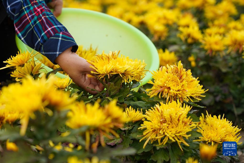 11月11日,農戶(hù)在前道口村采摘金絲皇菊。