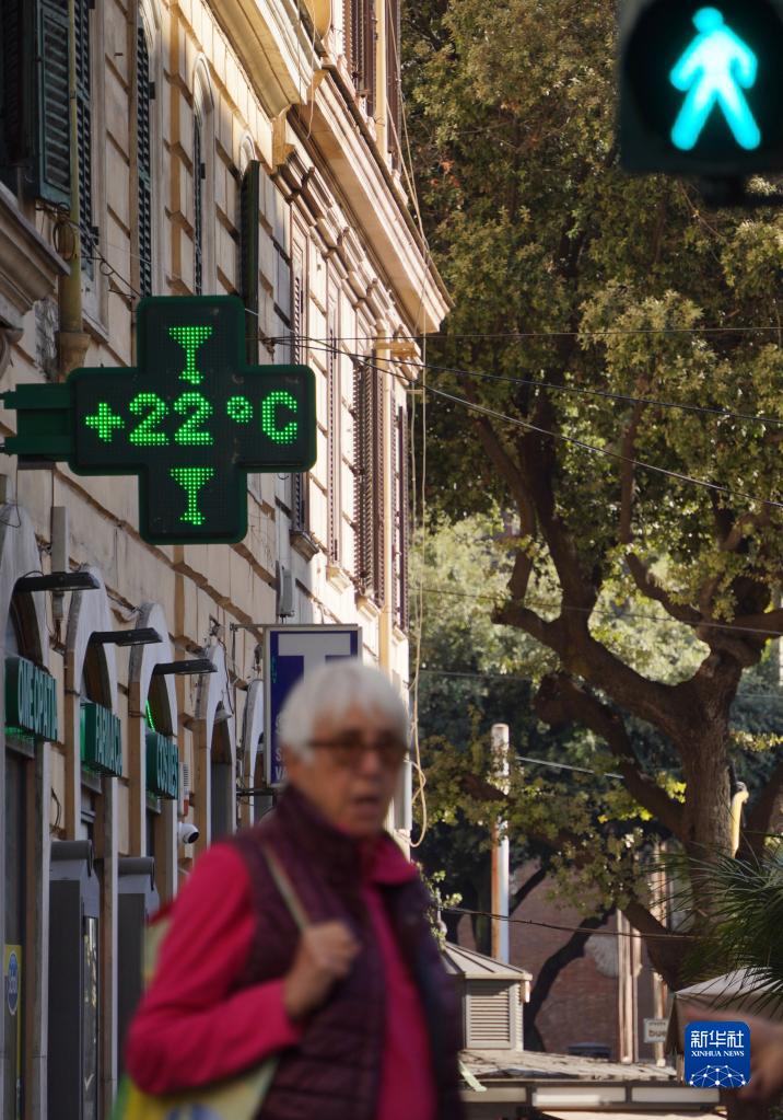 11月11日,意大利羅馬一處藥店的溫度計顯示實(shí)時(shí)溫度為22攝氏度。