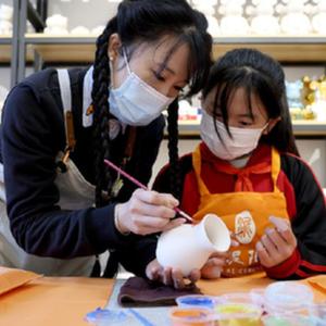 11月11日,江蘇省徐州市漢王鎮紫山村春泥陶藝的老師(左)在陶藝教室向學(xué)生講解彩陶繪陶的有關(guān)知識。