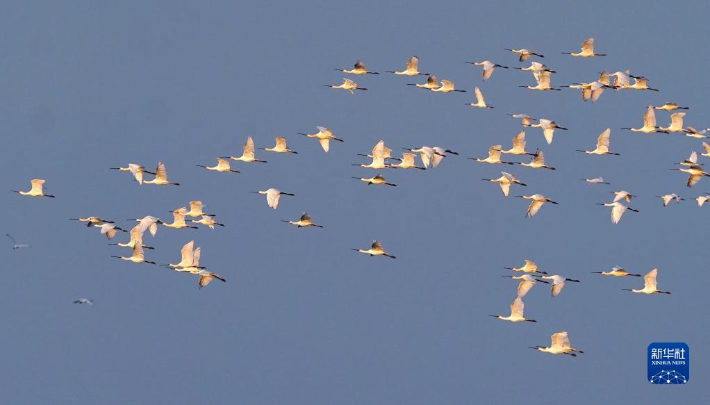 11月11日,一群白琵鷺在江西鄱陽(yáng)湖南磯濕地國家級自然保護區的濕地上空飛翔。