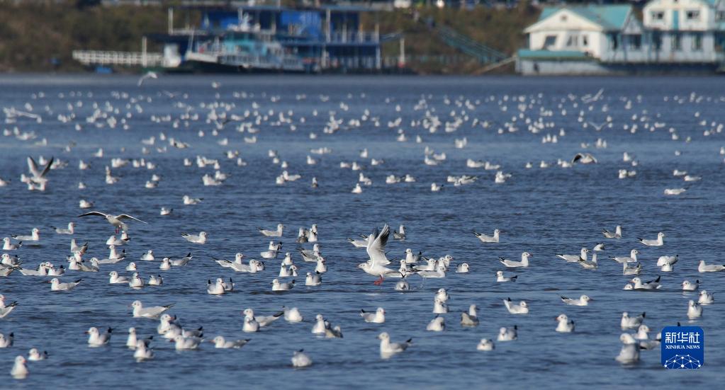 在松花江哈爾濱城區段,紅嘴鷗在覓食(2021年10月7日攝)。