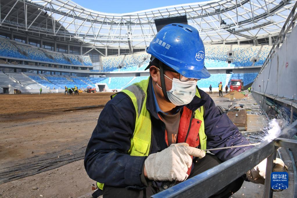 青島青春足球內場(chǎng),工人在進(jìn)行焊接作業(yè)(11月16日攝)。