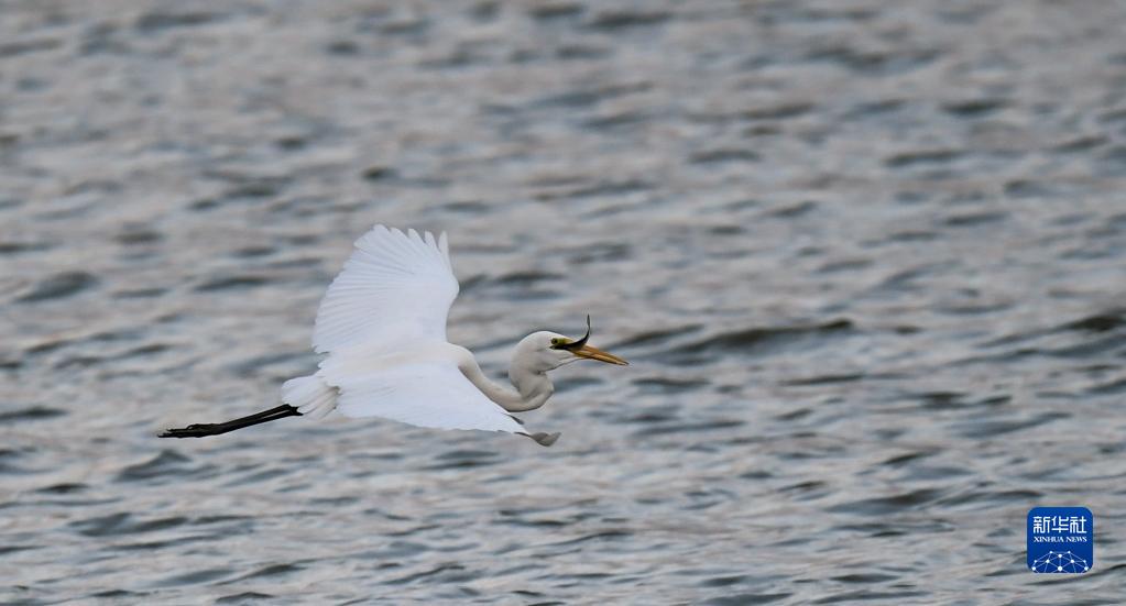 一只白鷺在海南東寨港國家級自然保護區內飛翔(2022年1月28日攝)。