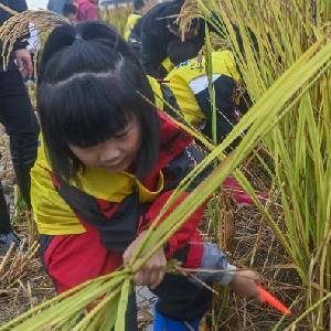 11月19日,孩子們在家長(cháng)的帶領(lǐng)下體驗傳統打稻谷。