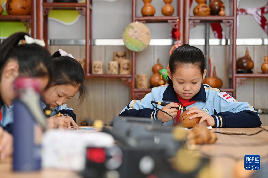 天津師范大學(xué)第三附屬小學(xué)的學(xué)生在練習葫蘆烙畫(huà)(11月18日攝)。
