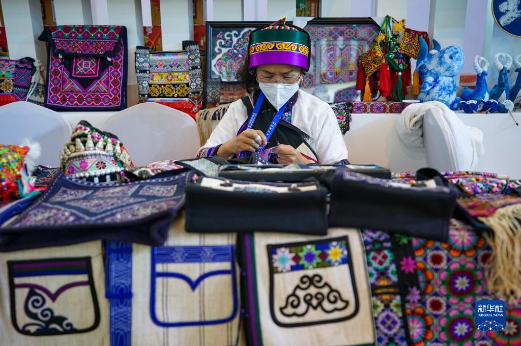 11月20日,一名彝繡傳承人在南博會(huì )旅游文化館內進(jìn)行刺繡展示。