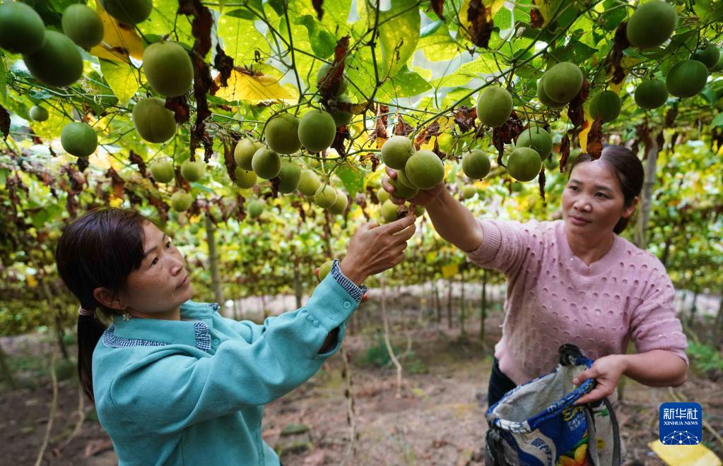 11月20日,村民在廣西融水苗族自治縣安陲鄉龍口村采摘羅漢果。