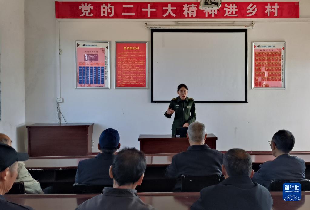 陸軍工程大學(xué)“星火”理論宣講服務(wù)政治教員群體成員黃貽蘇為湖北省紅安縣中和司村村民宣講黨的二十大精神(2022年11月3日攝)。新華社發(fā)(李亞運 攝)