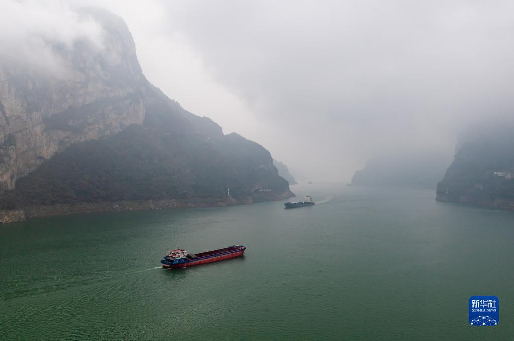 初冬時(shí)節,湖北省宜昌市秭歸縣西陵峽上空云霧繚繞,船行江上,宛如一幅水墨畫(huà)卷。