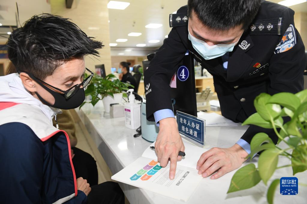 11月22日,在新昌縣公安局出入境管理大隊辦事窗口,工作人員向一名智利籍足球教練(左)介紹居留延期政策。