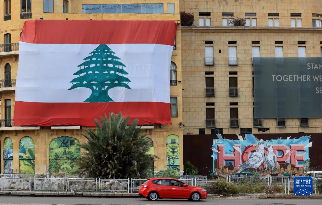 11月22日,一輛汽車(chē)駛過(guò)黎巴嫩首都貝魯特街頭懸掛的巨型國旗。