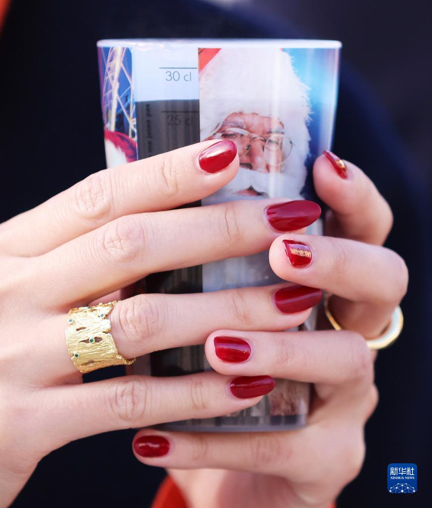 11月24日,一名女子在法國巴黎杜伊勒里花園的圣誕市場(chǎng)品嘗熱紅酒。