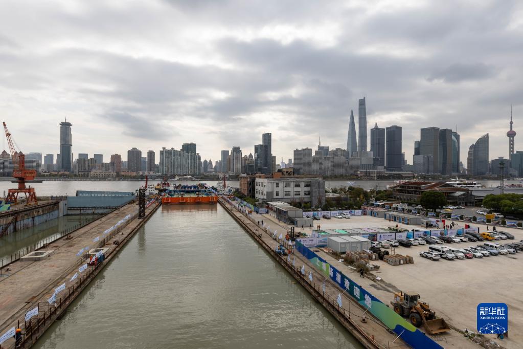 11月25日,“奮力”輪載著(zhù)長(cháng)江口二號古船進(jìn)入上海船廠(chǎng)舊址1號船塢。
