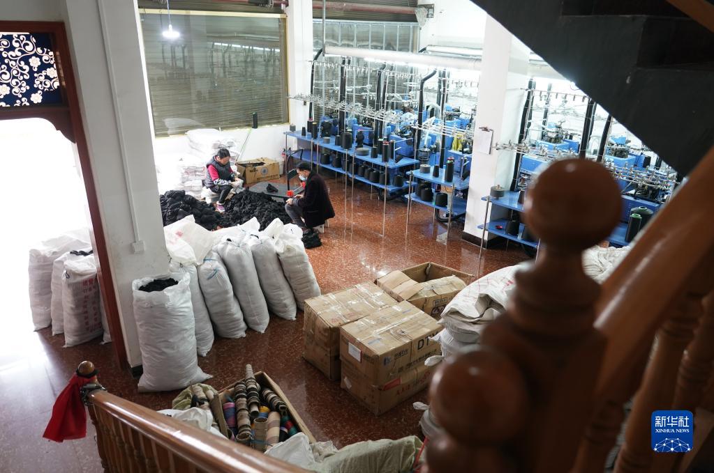 11月23日,陜西安康市紫陽(yáng)縣紅椿鎮七里溝社區居民郭世清(右)在自家房屋內的“家庭工坊”中織襪?!凹彝スし弧庇缮鐓^織襪合作社提供機器,社區居民提供家中場(chǎng)地和勞力,并獲得計件報酬。
