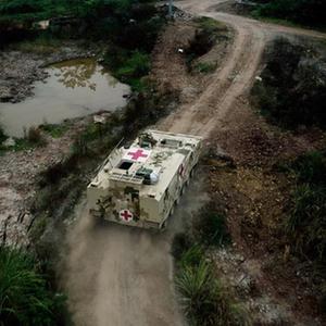 11月14日,在“衛勤力量-2022A1”基地化訓練中,裝甲救護組前往連集傷點(diǎn)前接“傷員”(視頻截圖)。新華社發(fā)(蔣松洋 攝)