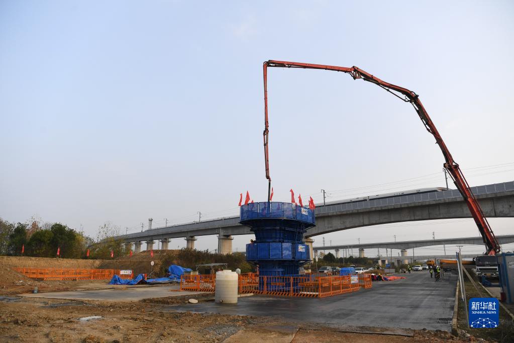 11月26日,中鐵四局施工人員在新建滬寧合高鐵安徽段首根墩身澆筑現場(chǎng)作業(yè)。