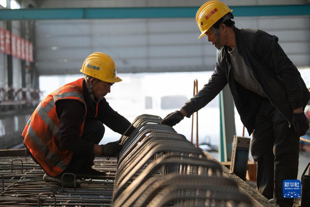 11月25日,在“智慧梁廠(chǎng)”生產(chǎn)線(xiàn)上,工作人員在綁扎防撞護欄預埋鋼筋。