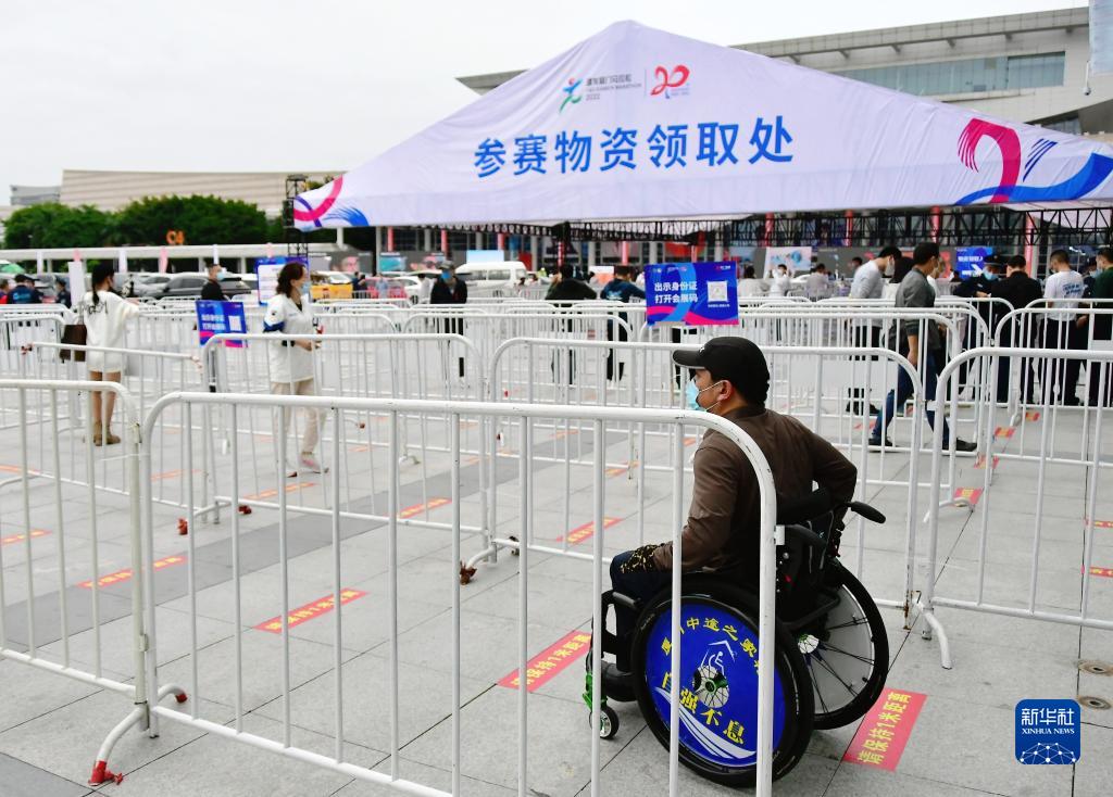 在賽前,謝啟明坐著(zhù)輪椅領(lǐng)取馬拉松比賽的物資(11月25日攝)。新華社記者 魏培全 攝