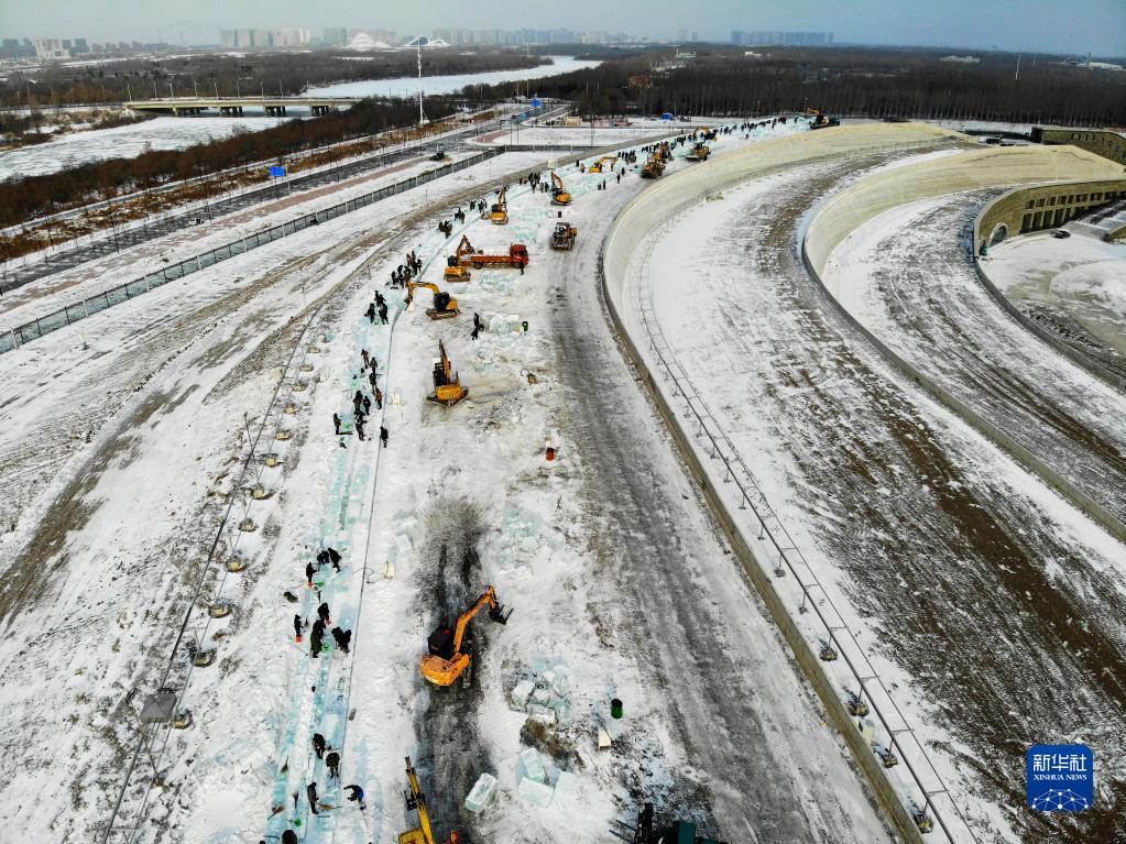 這是11月29日拍攝的哈爾濱冰雪大世界園區冰建項目施工現場(chǎng)(無(wú)人機照片)。