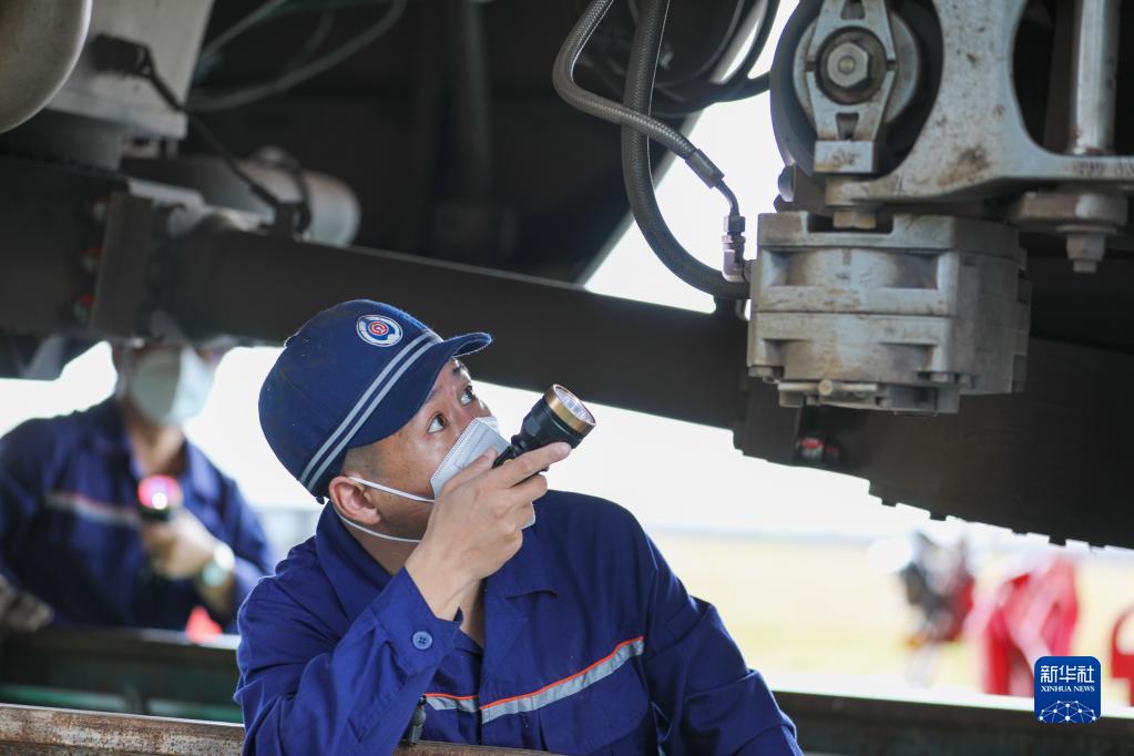 8月1日,在老撾首都萬(wàn)象,中老鐵路雙方員工共同檢修列車(chē)。