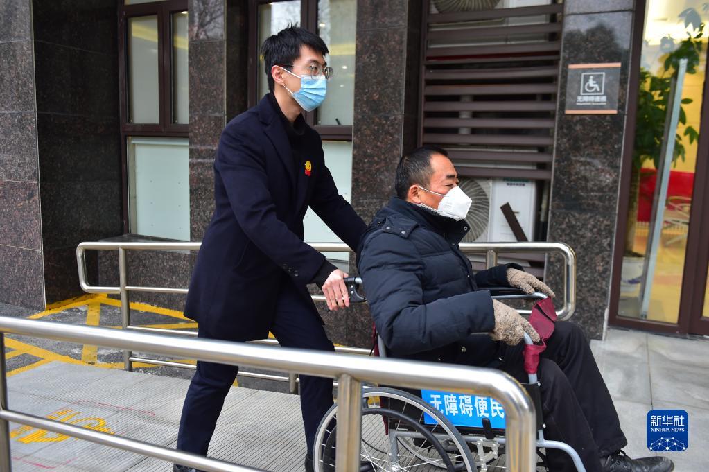 江西省南昌市紅谷灘區市民中心的工作人員推著(zhù)市民劉順保通過(guò)無(wú)障礙通道前往中心大廳(12月2日攝)。