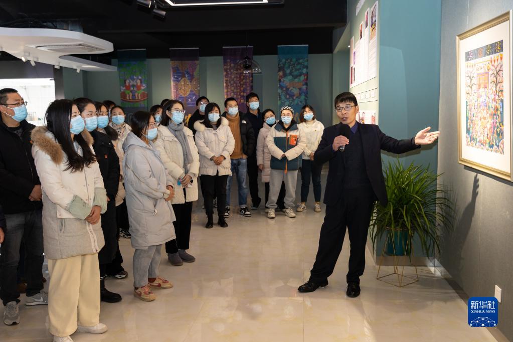 12月4日,江蘇省南京市六合區農民畫(huà)美術(shù)館內,一場(chǎng)以江蘇省非物質(zhì)文化遺產(chǎn)六合農民畫(huà)為載體的黨的二十大精神宣講會(huì )舉行。這是六合區冶山街道文體服務(wù)中心主任胡斌(右一)帶領(lǐng)參加活動(dòng)的基層干部群眾參觀(guān)農民畫(huà)。新華社發(fā) (張夢(mèng) 攝)