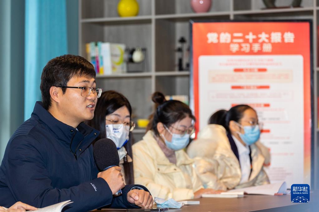 12月4日,江蘇省南京市六合區農民畫(huà)美術(shù)館內,一場(chǎng)以江蘇省非物質(zhì)文化遺產(chǎn)六合農民畫(huà)為載體的黨的二十大精神宣講會(huì )舉行。這是冶山街道雙墩村黨總支書(shū)記耿云松(左一)在發(fā)言。新華社發(fā)(張夢(mèng)攝)