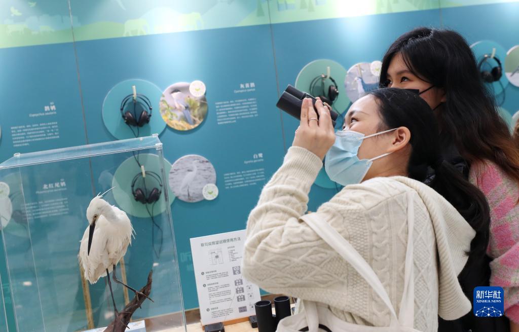 12月7日,參觀(guān)者在上海自然博物館體驗使用望遠鏡觀(guān)看遠處的鳥(niǎo)類(lèi)圖片。