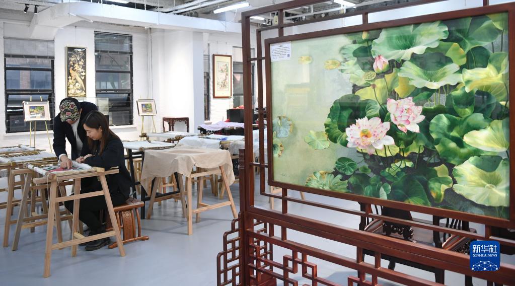 在廣州市荔灣區的工作室,王新元傳授學(xué)員廣繡技法(12月6日攝)。
