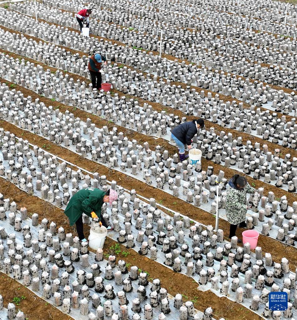12月7日,在湖南省永州市道縣壽雁鎮黑木耳種植基地,村民在采摘黑木耳(無(wú)人機照片)。