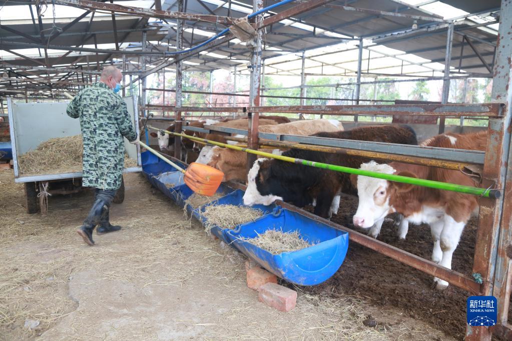 江西省南昌市安義縣江西創(chuàng )衍生農業(yè)生態(tài)有限公司的工作人員正在喂牛(12月7日攝)。