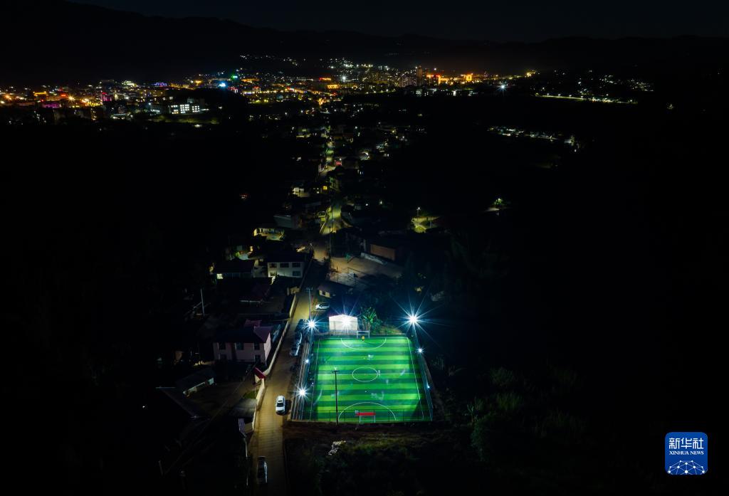這是無(wú)人機拍攝的夜色中的云南省滄源佤族自治縣龍乃村足球場(chǎng)(12月7日攝)。