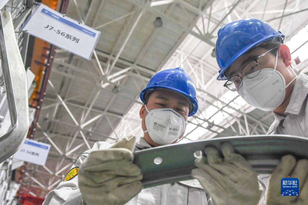 12月14日,在位于長(cháng)春的一汽解放汽車(chē)有限公司卡車(chē)廠(chǎng)沖壓車(chē)間,馮斌(左)與同事王金生研究改進(jìn)生產(chǎn)工藝。