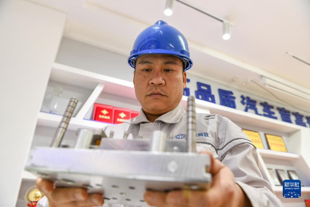 12月14日,在位于長(cháng)春的一汽解放汽車(chē)有限公司卡車(chē)廠(chǎng)沖壓車(chē)間勞模創(chuàng )新工作室,馮斌查看教學(xué)模型。