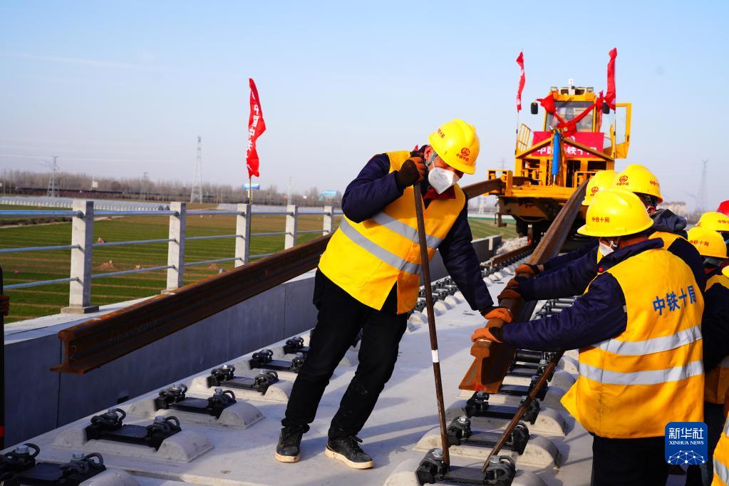 12月15日,在濟鄭高鐵山東聊城段,中鐵十局的工作人員在進(jìn)行鋪軌作業(yè)。