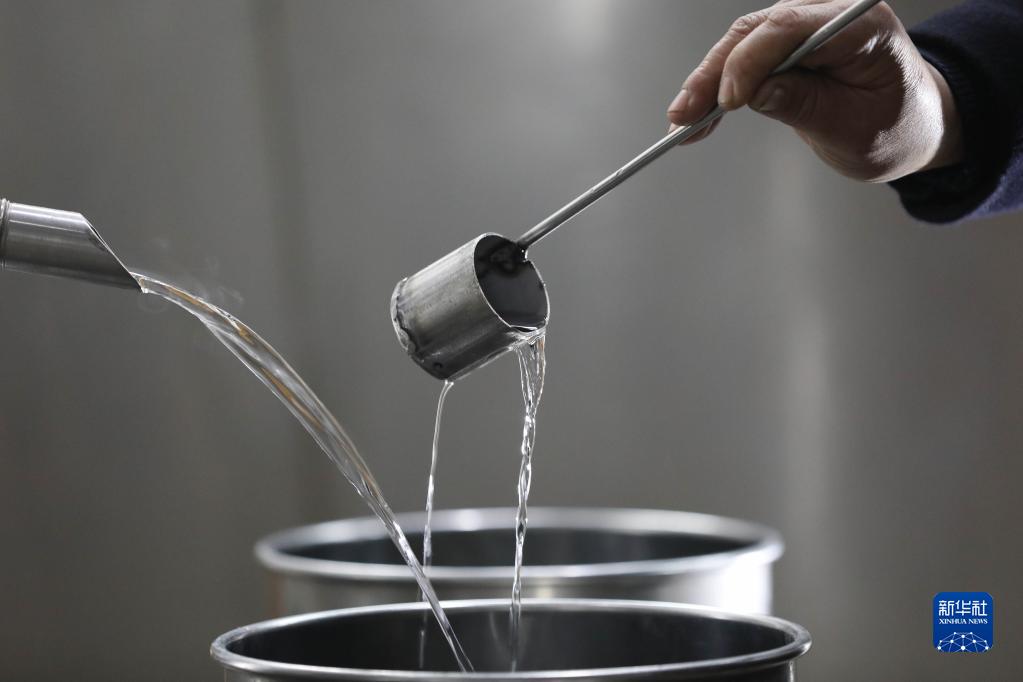 12月16日,工人在寶豐縣邢莊村一釀酒車(chē)間查看白酒品質(zhì)。