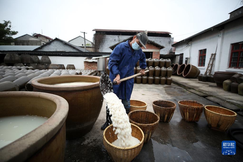 12月16日,在浙江省東陽(yáng)市馬宅鎮屠梁村一酒廠(chǎng),釀酒師傅將浸泡后的糯米撈出。