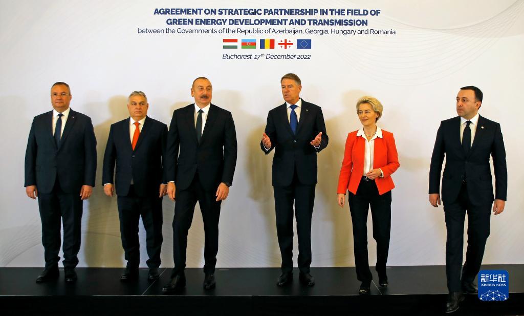 12月17日,在羅馬尼亞首都布加勒斯特,羅馬尼亞總理丘克、匈牙利總理奧爾班、阿塞拜疆總統阿利耶夫、羅馬尼亞總統約翰尼斯、歐盟委員會(huì )主席馮德萊恩和格魯吉亞總理加里巴什維利(從左至右)在阿格羅匈四國綠色能源開(kāi)發(fā)與運輸戰略伙伴協(xié)議簽字儀式上合影。