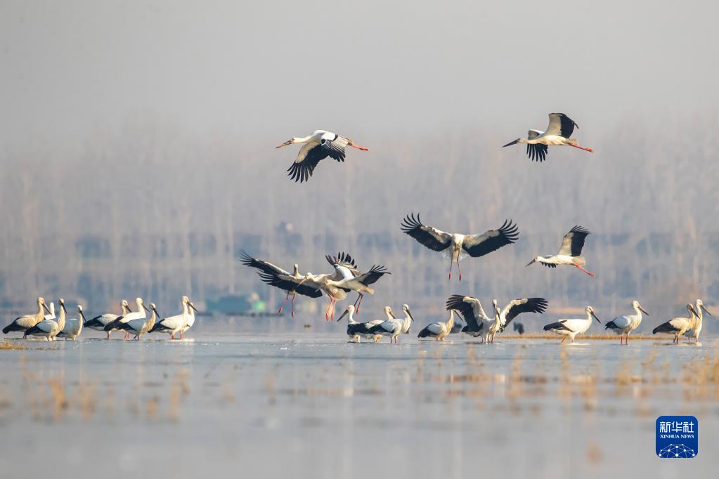 12月19日,一群東方白鸛在沂河山東省臨沂市郯城縣馬頭段飛舞、休憩。