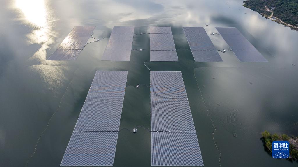 這是12月8日在泰國烏汶府詩(shī)琳通水庫拍攝的浮體光伏項目(無(wú)人機照片)。