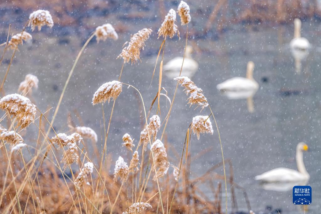 日前,河南三門(mén)峽天鵝湖國家城市濕地公園迎來(lái)小雪。白天鵝在雪中游弋,與冬景相映成趣。