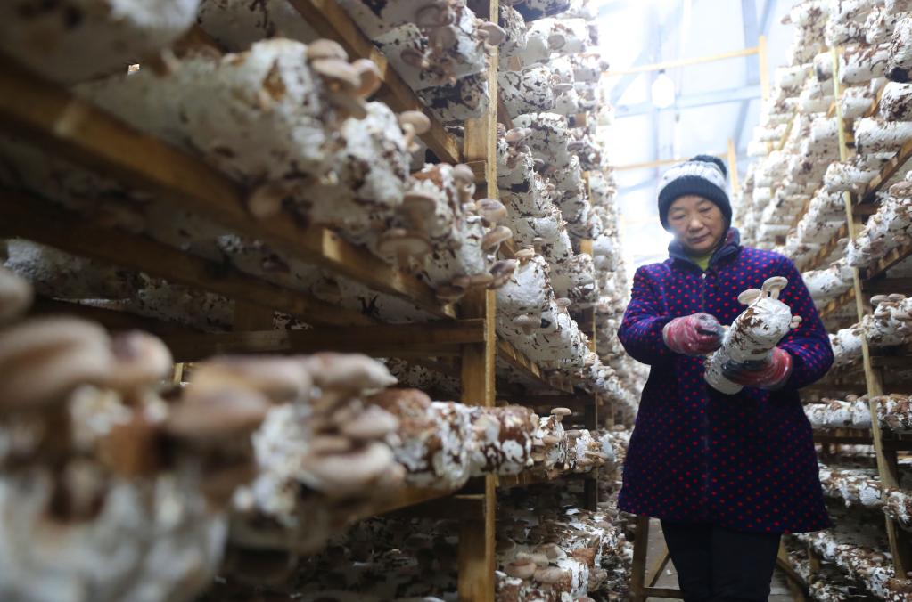 12月27日,在衡東縣三樟鎮義門(mén)村,村民在采摘香菇。
