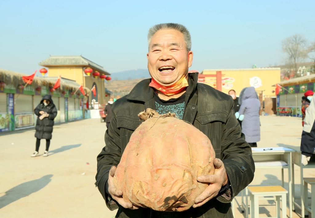 12月30日,在汝陽(yáng)紅薯擂臺賽上,農民展示參賽的紅薯。