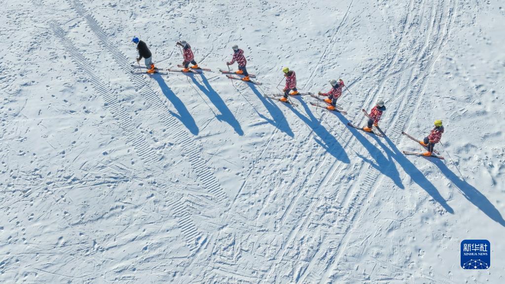 2022年12月31日,滑雪愛(ài)好者在河北省遵化市一家滑雪場(chǎng)練習滑雪(無(wú)人機照片)。