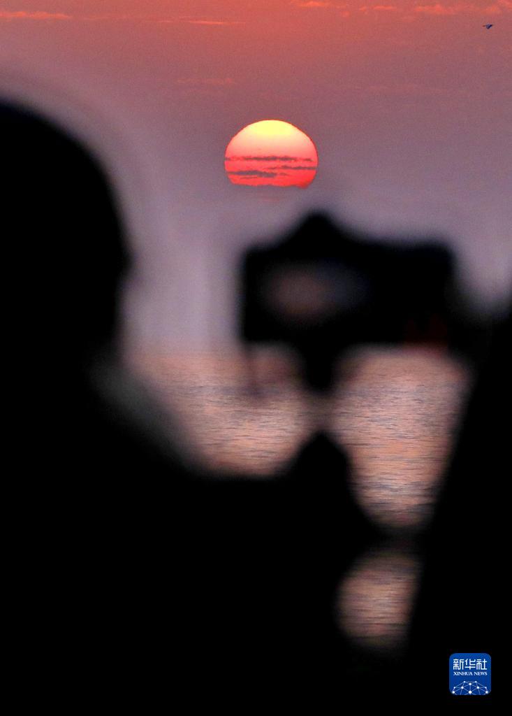 1月1日清晨,市民在上海金山城市沙灘迎接日出。