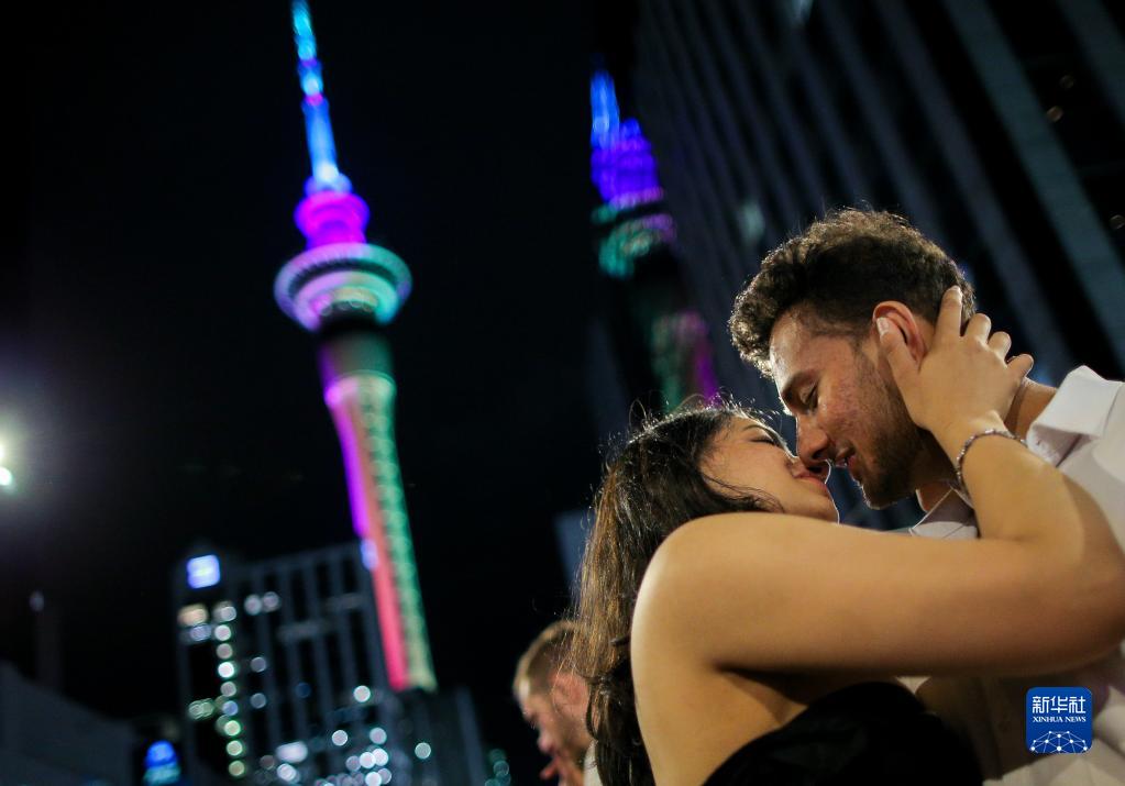 2023年1月1日,一對情侶在新西蘭奧克蘭的天空塔下熱吻。